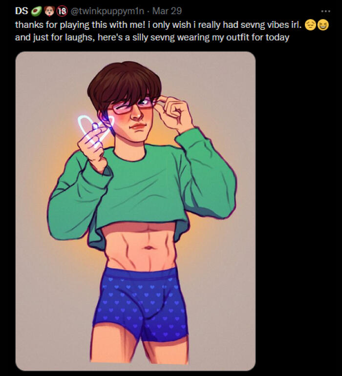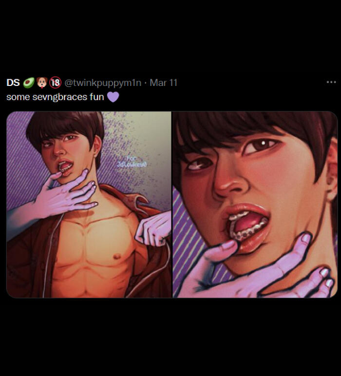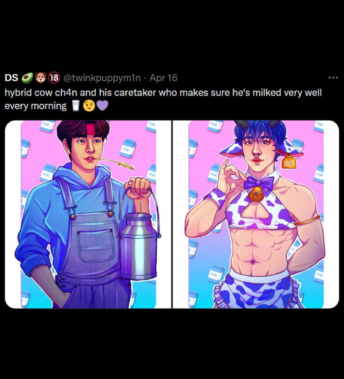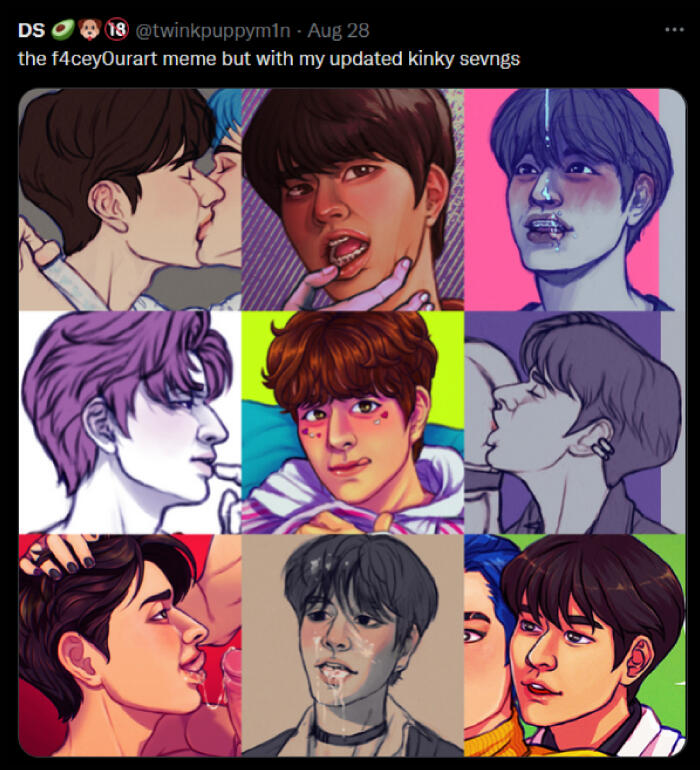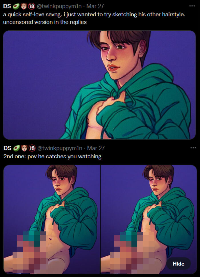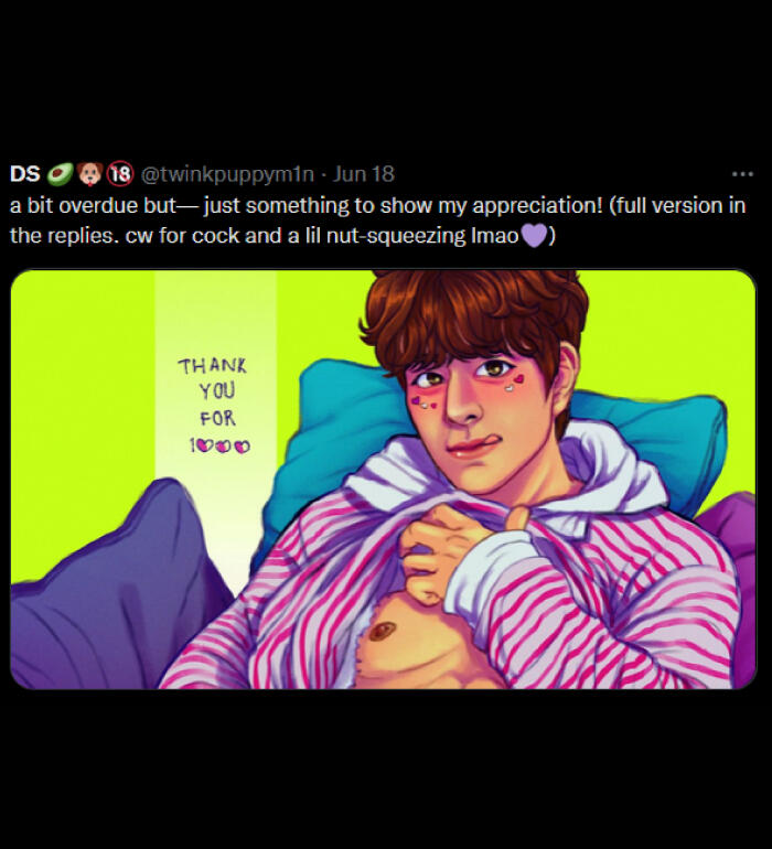 NSFW: i draw and share sims screenshots of explicit content that aren't always tagged (feel free to remind me), i draw a lot of cocks (usually under filters but not 100% of the time), i curse, i like/rt/interact with some p0rn accounts, content with hard kinks and dead dove, i like exploring things outside my comfort zone
