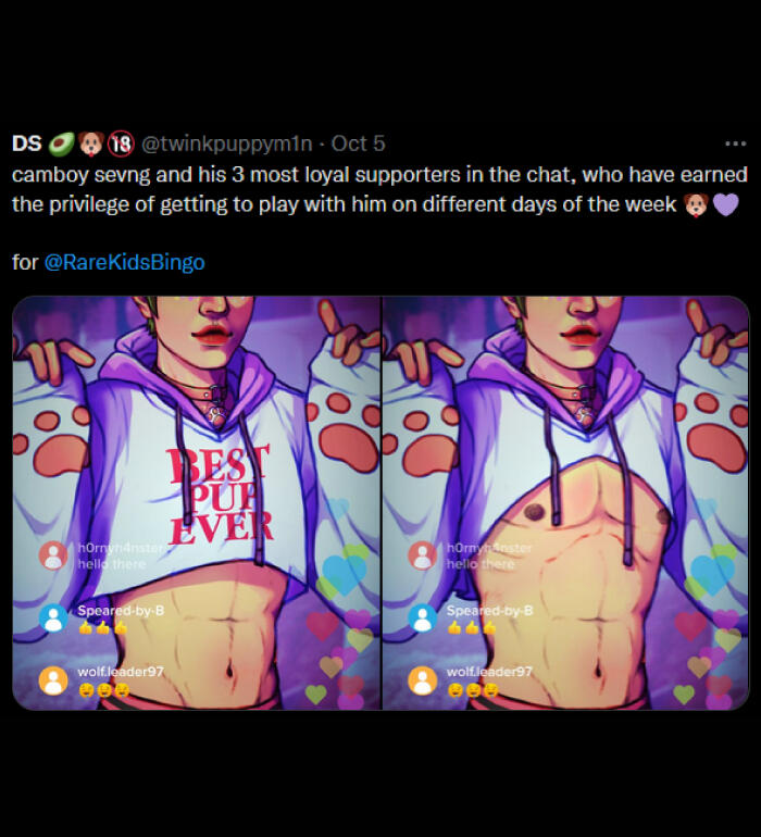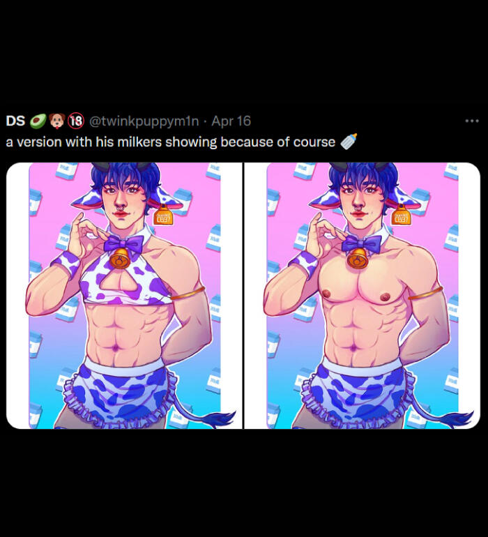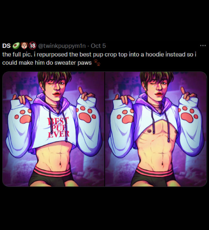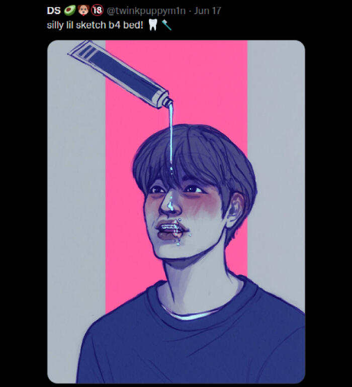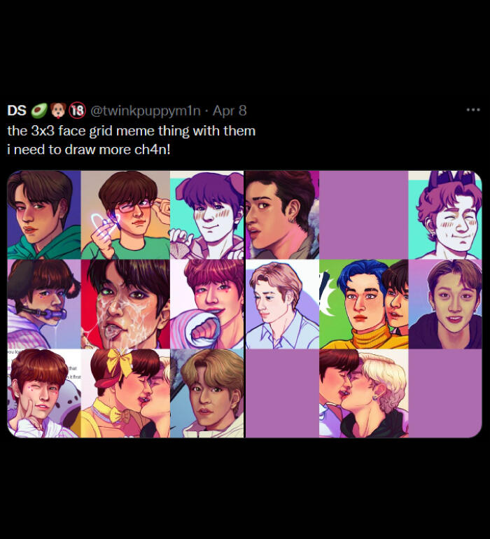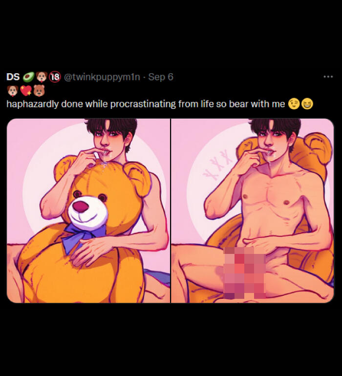 NSFW: i draw and share sims screenshots of explicit content that aren't always tagged (feel free to remind me), i draw a lot of cocks (usually under filters but not 100% of the time), i curse, i like/rt/interact with some p0rn accounts, content with hard kinks and dead dove, i like exploring things outside my comfort zone